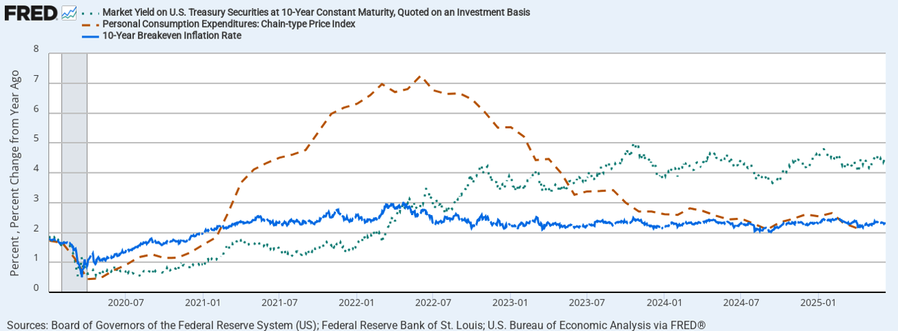 Long-term inflation expectations have stabilized as actual inflation has eased from its peak. The 10-year breakeven inflation rate—derived from the spread between nominal Treasuries and inflation-protected securities—provides market-based evidence that long-term inflation concerns have moderated.